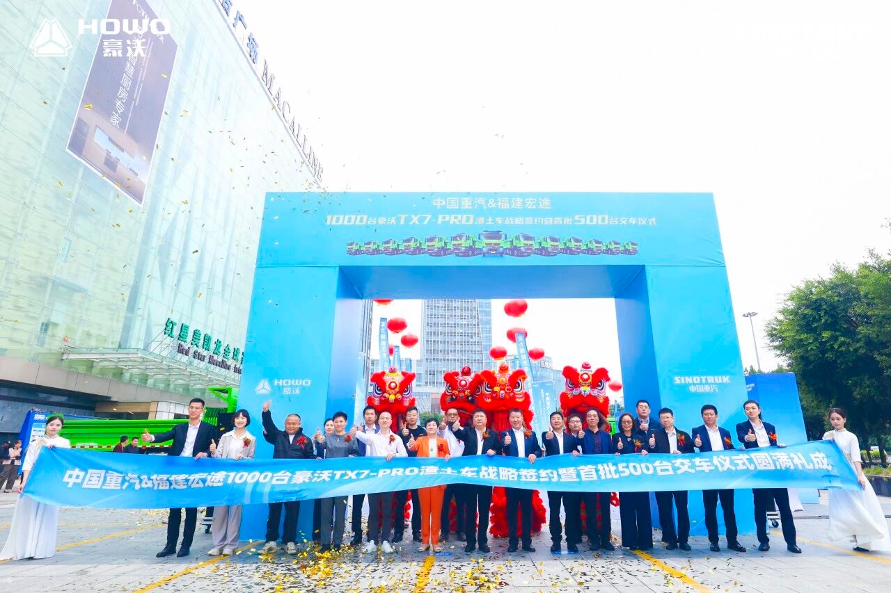 ??八闽福地,山海和鸣。10月28日,中国重汽与福建宏途1000台豪沃TX7-PRO渣土车战略签约暨首批500台交车仪式在福建福州圆满举行。本次合作秉持“合规、智能、高效”的核心理念,以高端装备的可靠品质与卓越性能,为福州城市建设与运力升级注入强劲动能。